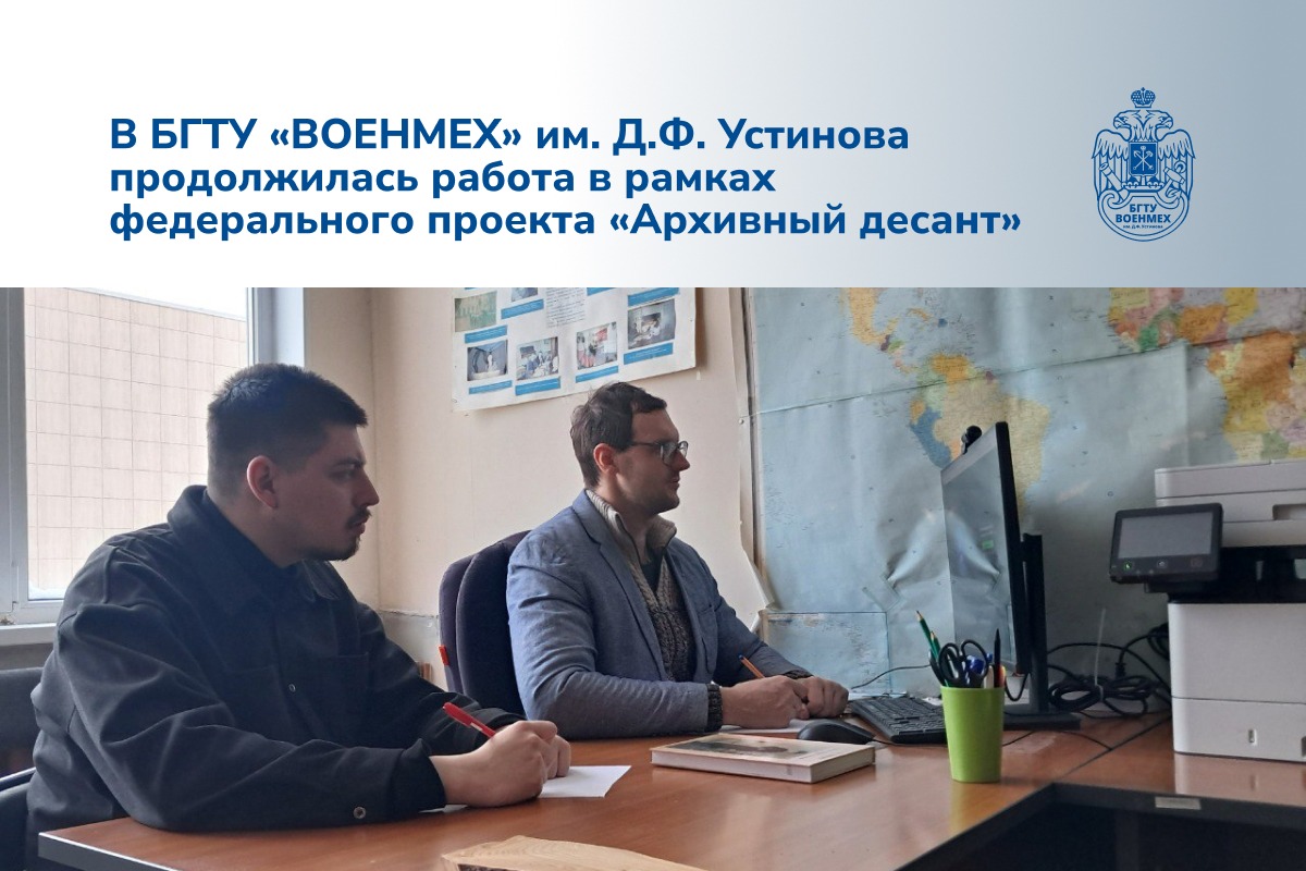 Согласно поручению ректора БГТУ «ВОЕНМЕХ» им. Д.Ф. Устинова, д-ра техн. наук, профессора Шашурина Александра Евгеньевича, сотрудники и студенты университета продолжили работу в рамках федерального проекта «Архивный десант».