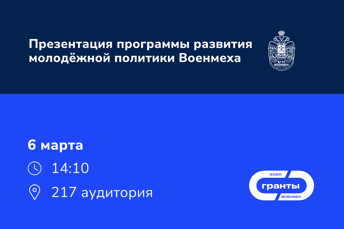 6 марта в 14:10 пройдёт презентация ключевых направлений программы развития молодёжной политики нашего Университета, на которой студенты смогут вопросы представителям Управления молодёжной политики и студенческого досуга. В рамках презентации программы развития будут представлены проектные инициативы, которые лягут в основу заявки БГТУ «ВОЕНМЕХ» им. Д.Ф. Устинова на Всероссийский конкурс молодёжных проектов среди образовательных организаций высшего образования [...]