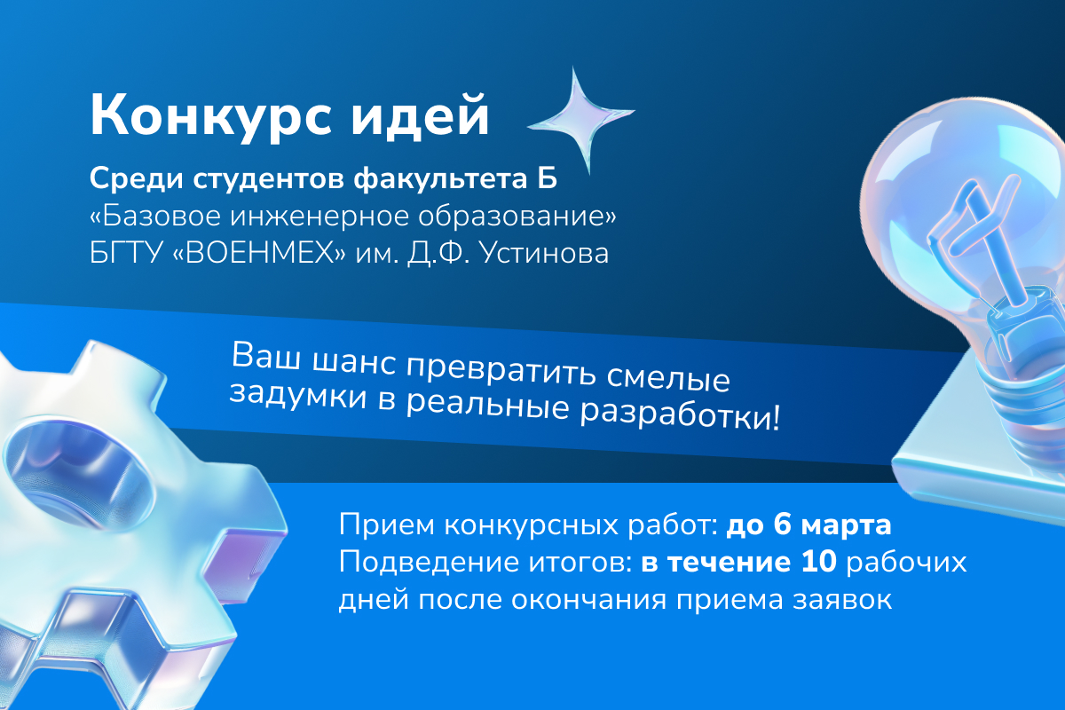 Конкурсы0pxБГТУ «ВОЕНМЕХ» им. Д.Ф. Устинова объявляет старт уникального конкурса идей, призванного выявить и поддержать самые перспективные студенческие проекты. Это ваш шанс превратить смелые задумки в реальные разработки, получить ценный опыт и заявить о себе в мире инноваций и предпринимательства.