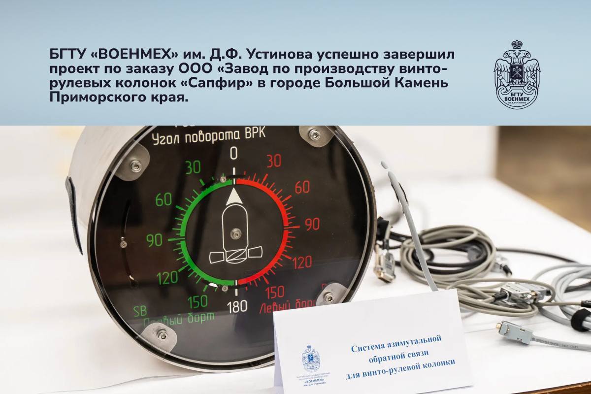 Новости0px9 апреля 2026 г. БГТУ «ВОЕНМЕХ» им. Д.Ф. Устинова успешно завершил опытно-конструкторский проект по заказу ООО «Завод по производству винто-рулевых колонок «Сапфир» (г. Большой Камень, Приморский край). В рамках сотрудничества силами Опытно-конструкторского бюро и Инжинирингового центра университета были спроектированы, изготовлены, испытаны и переданы заказчику три системы определения азимутальной обратной связи.
