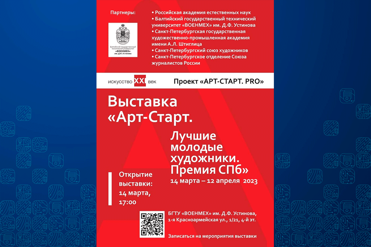 С 14 марта по 12 апреля 2023 года в Балтийском государственном техническом университете «ВОЕНМЕХ» им. Д.Ф. Устинова пройдет выставка работ финалистов конкурса «АРТ-СТАРТ. Лучшие молодые художники. Премия СПб» культурно-просветительского проекта «АРТ-СТАРТ PRO». Организатором конкурса является Некоммерческое партнерство содействия реализации культурных проектов «Искусство XXI век» при партнерской поддержке Российской академии естественных наук, Балтийского государственного технического университета «ВОЕНМЕХ» им. Д.Ф. Устинова, Санкт-Петербургской государственной художественно-промышленной академии им. А.Л. Штиглица, Санкт-Петербургского союза художников, Санкт-Петербургского отделения Союза журналистов России.