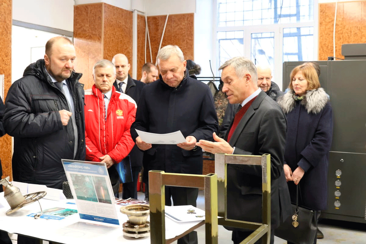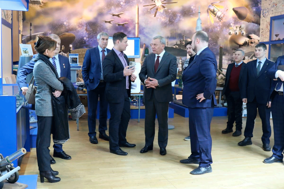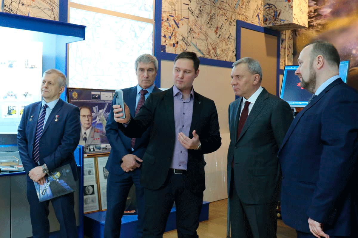 Проректор по научной работе и инновационному развитию С.А. Матвеев совместно с доцентом кафедры «Ракетостроение», героем РФ, летчиком-космонавтом А.И. Борисенко ознакомили Ю.И. Борисова и членов делегации с научно-техническими результатами деятельности университета.
