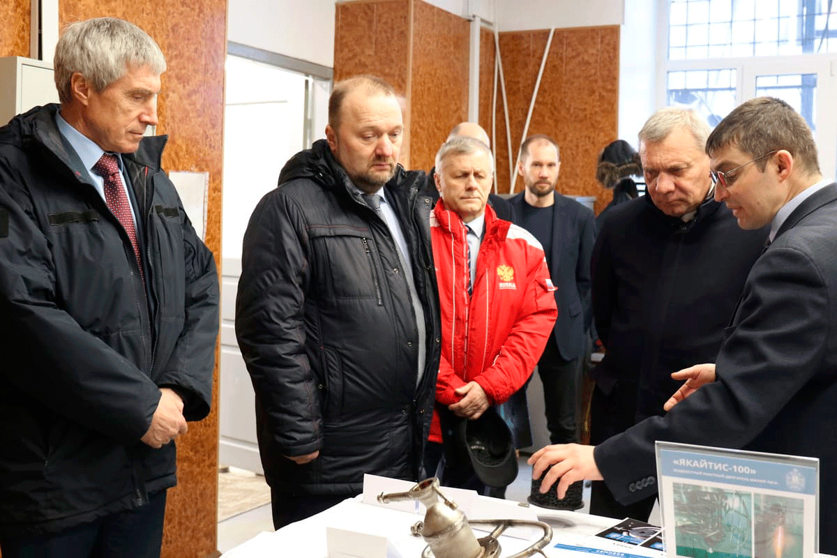 Визит начался со знакомства с разработками вуза в области проектирования и разработки двигателей и энергетических установок на кафедре «Двигатели и энергоустановки летательных аппаратов», заведующий кафедрой А.А. Левихин рассказал о направлениях научно-исследовательской деятельности кафедры, провел демонстрационный запуск жидкостного ракетного двигателя на топливной паре «газообразный кислород – газообразный водород» с тягой 100 Н разработанный в университете для перспективного малого разгонного блока сверхлегкой ракеты носителя. Также гостям был представлен опытно-экспериментальный образец турбореактивного ракетного двигателя «ТРД 20», организован запуск и показаны различные режимы его работы.