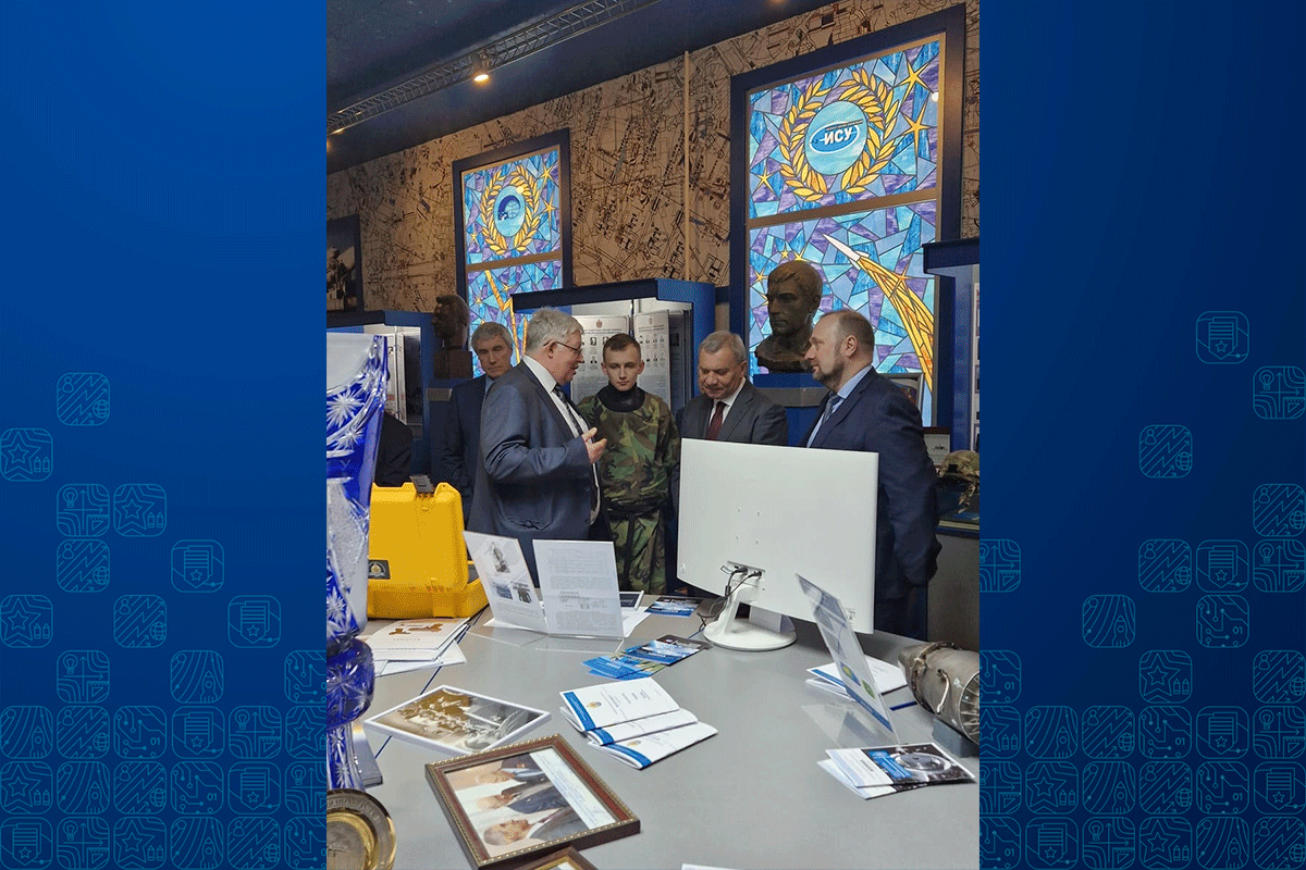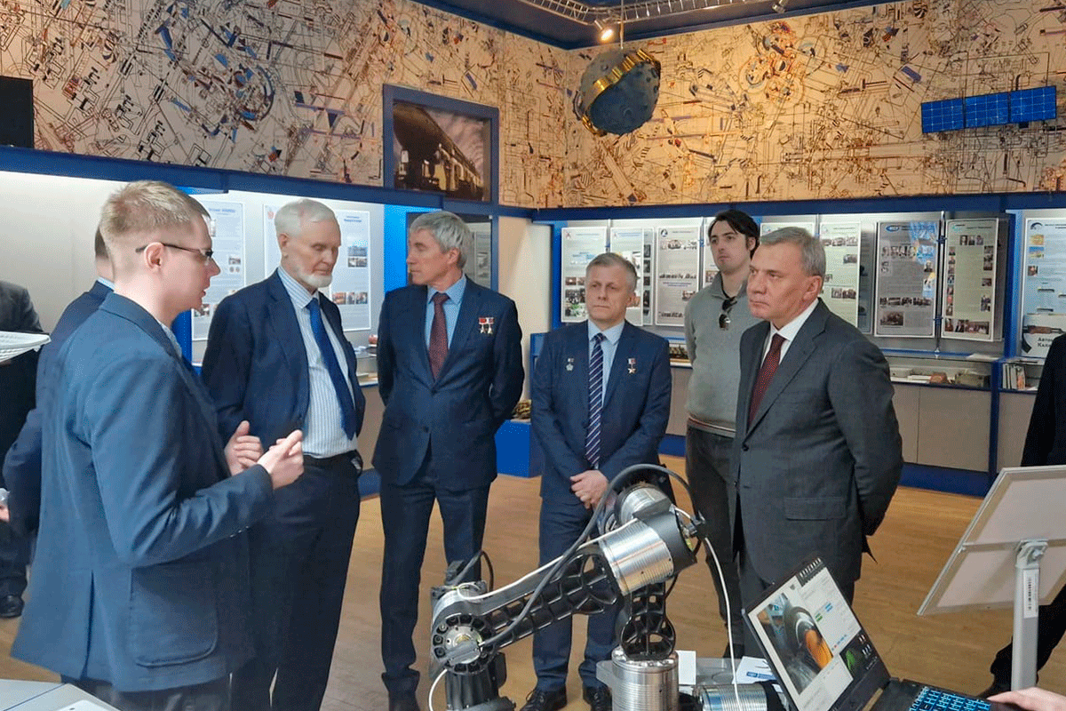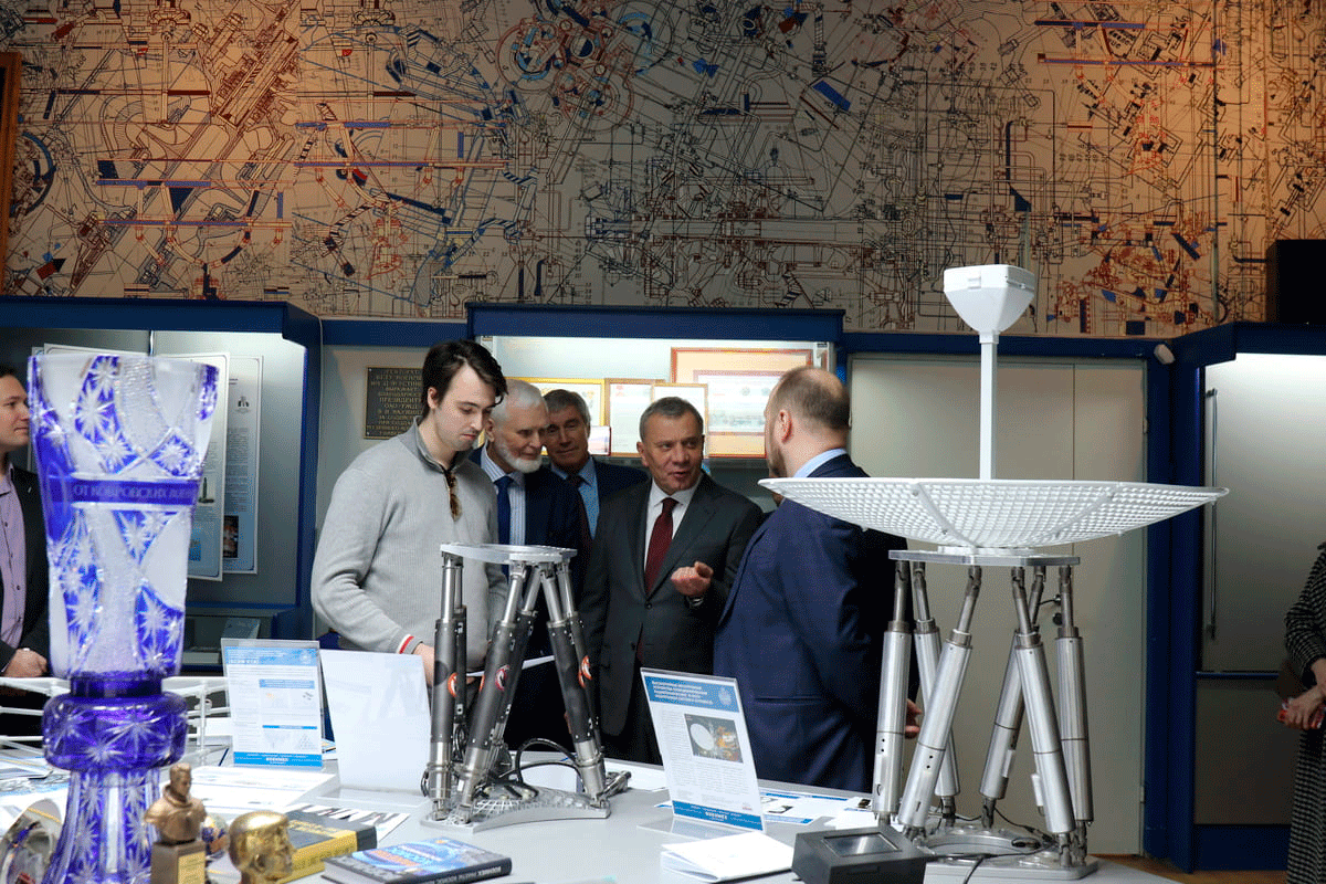 В музее университета Ю.И. Борисову были представлены перспективные научно-технические разработки по широкому спектру научно-технической деятельности университета в интересах авиационной и ракетно-космической отраслей. Н.С. Слободзян – начальник НИЛ РиМС презентовал многостепенной робот-манипулятор, а К.А. Шахорко – начальник НИЛ РИУС проинформировал о беспроводных системах управления крупногабаритных трансформируемых наземных и космических конструкций прецизионных приводов. В обсуждении результатов НИОКР, выполняемых в интересах предприятий «Роскосмоса», активное участие принял профессор базовой кафедры, директор отраслевого центра крупногабаритных трансформируемых механических систем – заместитель генерального конструктора по механическим системам крупнейшего российского производителя спутников АО «Информационные спутниковые системы» им. акад. М.Ф. Решетнёва» В.И. Халиманович. Юрий Иванович отметил высокий уровень разработок университета в области робототехнических систем космического назначения и обратил внимание на перспективные проекты «малой космонавтики». Аспирант В.О. Гончаров представил макет спутника с полезной нагрузкой типа CubeSat. Проект реализуется в рамках проекта «Дежурный по планете» программы Space-π на базе БГТУ «ВОЕНМЕХ» им. Д.Ф. Устинова при совместном участии школьников, студентов и сотрудников университета. Презентацию макета малого межорбитального разгонного блока (космического буксира) сверхлегкой ракеты носителя провели П.В. Булат – главный научный сотрудник НИЛ БАКТС и М.И. Кислицкий – старший научный сотрудник НИЛ БАКТС. Далее С.А. Чириков –начальник Студенческого конструкторского бюро, представил новые разработки: роботизированная космическая оранжерея, многофункциональная тепловая камера и предметы экипировки космонавтов. Все разработки вызвали интерес со стороны как Ю.И. Борисова, так и исполнительного директора по пилотируемым космическим программам ГК «Роскосмос» С.К. Крикалева. В заключение А.И. Борисенко представил профориентационный проект университета «Инженерно-космическая школа», работающий на базе вуза второй год.