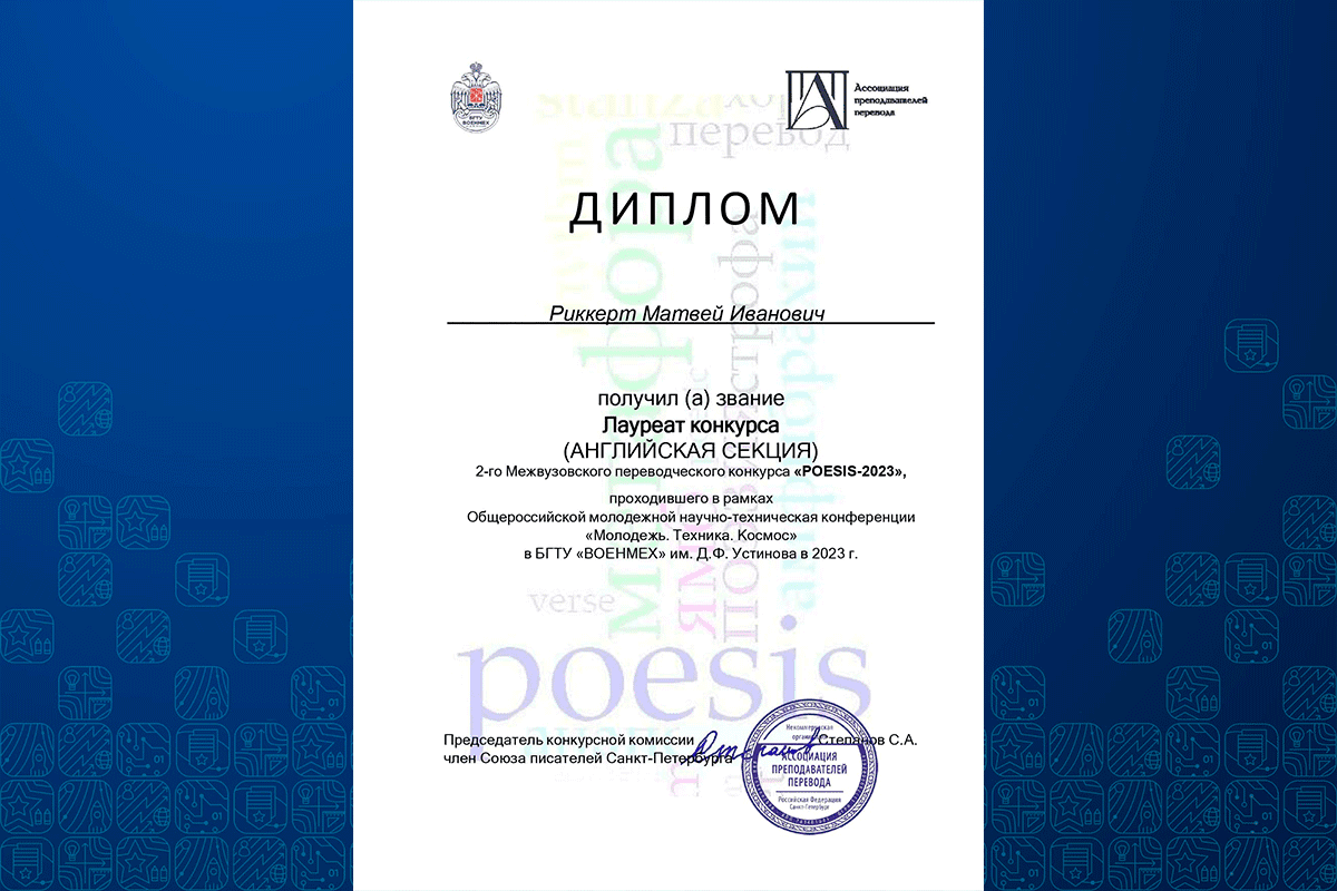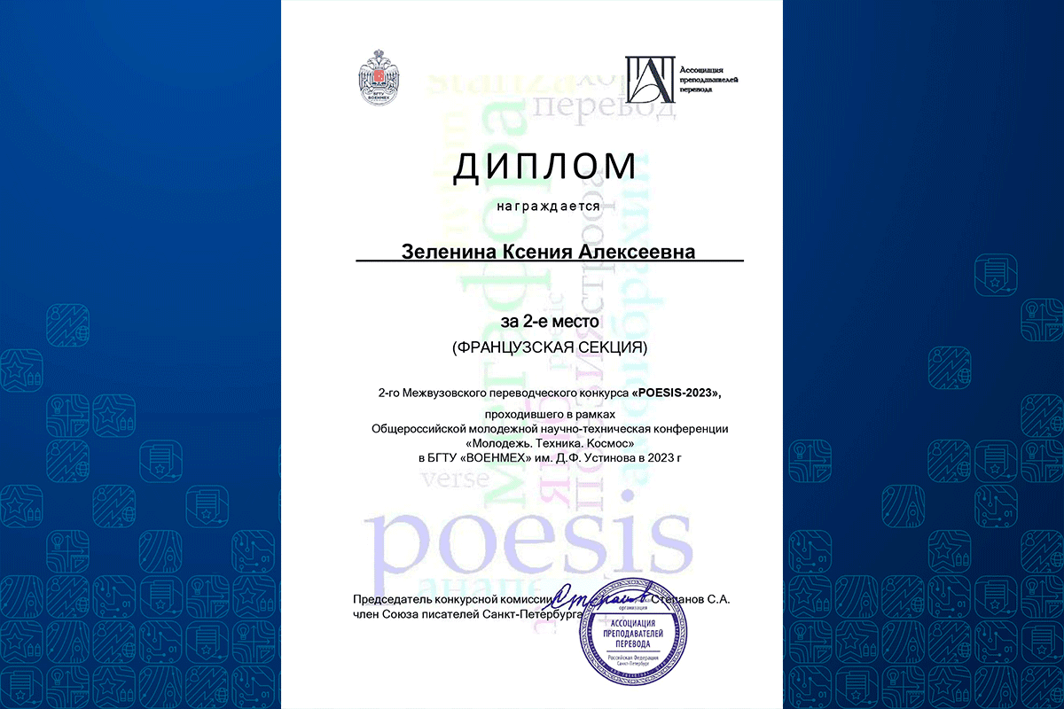 Наша кафедра специализируется на подготовке профессионалов в области специального перевода, а это значит, что на старших курсах наши студенты с воодушевлением учатся переводить инструкции, юридические документы, технические тексты и прочую «захватывающую» литературу. Но то, что душа просит чего-то вдохновляющего, возвышающего и восхищающего, показал только что прошедший конкурс «POESIS-2023». 14 студентов кафедры Р7 с разных курсов приняли участие в этом творческом состязании, и при том, что конкурс по факту оказался всероссийским, даже международным, и в нем приняли участие 114 человек из 46 вузов Российской Федерации, Республики Беларусь и Казахстана, наши ребята добились очень достойных результатов: