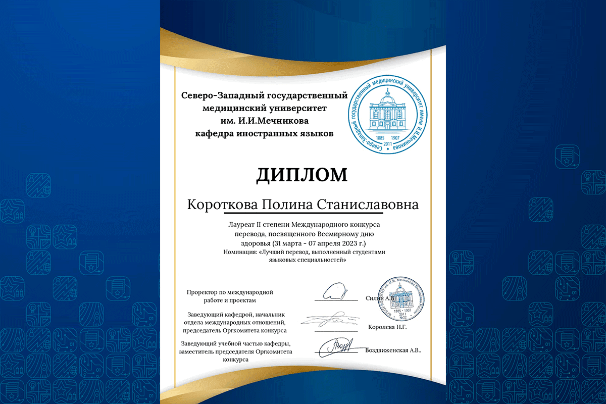7 апреля 2023 года огласили итоги Международного конкурса переводов, посвящённого Всемирному дню здоровья. Конкурс был организован и проведен кафедрой иностранных языков Северо-Западного государственного медицинского университета им. И.И. Мечникова. В конкурсе приняли участие более 500 человек со всех концов России и многих зарубежных стран. После строгого отбора к конкурсному оцениванию допустили 229 переводов текстов медицинской тематики: https://szgmu.ru/rus/m/6869/