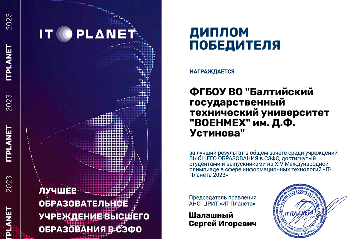 БГТУ «ВОЕНМЕХ» им. Д.Ф. Устинова награжден дипломом победителя за лучший результат в общем зачете среди учреждений высшего образования в Северо-Западном федеральном округе, достигнутый студентами и выпускниками на XIV международной олимпиаде в сфере информационных технологий «IT-Планета 2023».