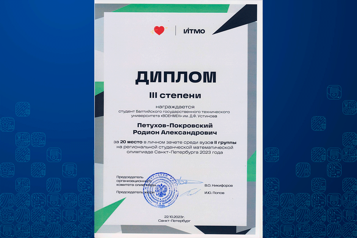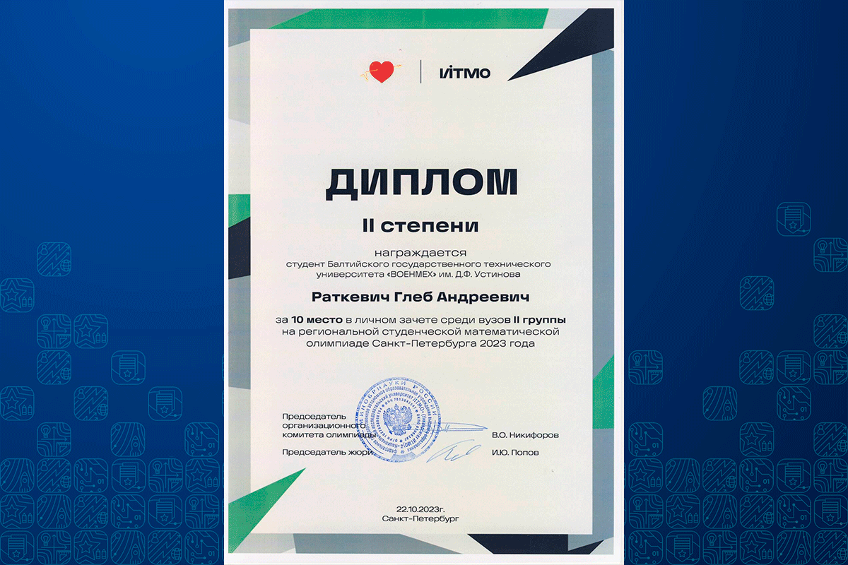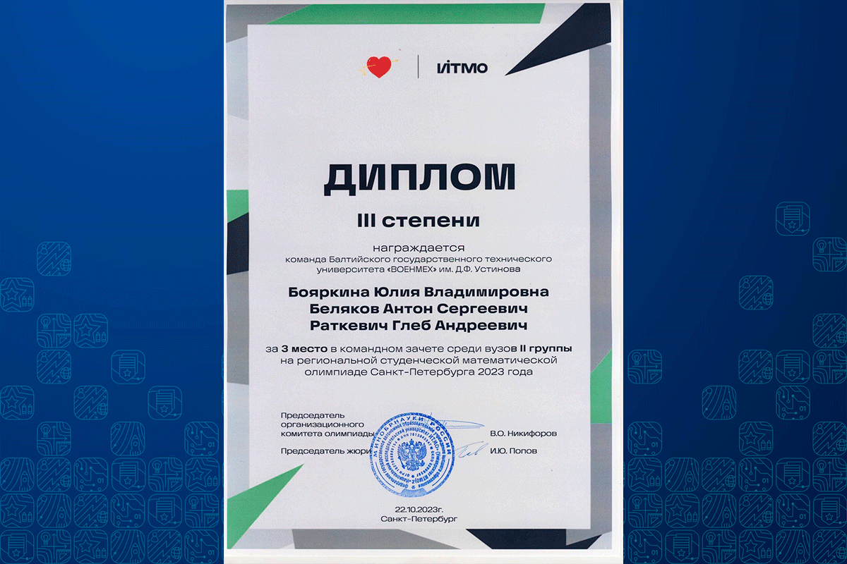 Глеб Раткевич (гр. А831С) – диплом второй степени, Антон Беляков (гр. А104С) и Родион Петухов-Покровский (гр. А111С) – дипломы третьей степени.