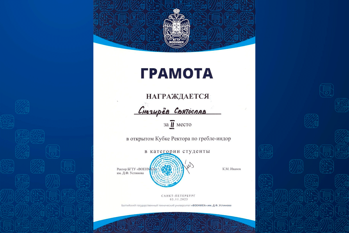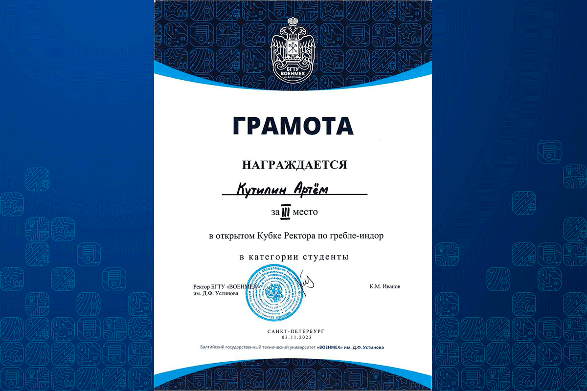 3 ноября 2023 года в игровом зале БГТУ «ВОЕНМЕХ» им. Д.Ф. Устинова прошел открытый Кубок ректора по гребле-индор, в котором приняли участие представители вузов С-Петербурга: СПбГМТУ — Корабелка; СПбГУТ им. проф. М.А. Бонч-Бруевича; НГУ им. П.Ф. Лесгафта; СЗИУ РАНХиГС; ГУМРФ им. адм. С.О. Макарова.