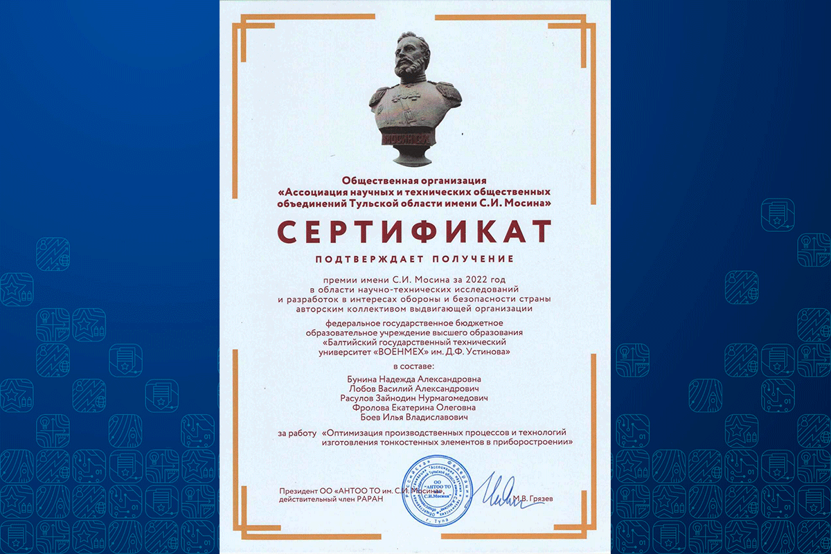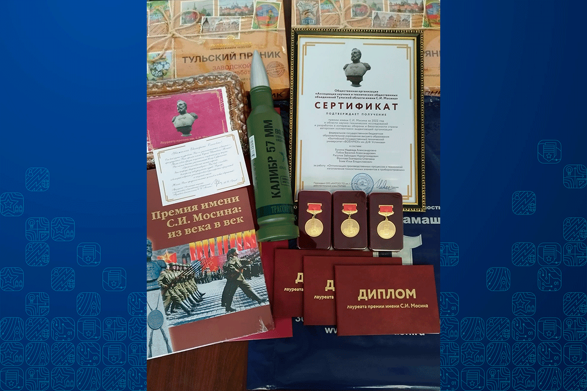 В этом году обладателями премии стали авторские коллективы из Тулы, Самары, Москвы и Санкт-Петербурга, принимавшие участие в создании инновационного вооружения и военной техники в 2022-2023 гг. За работу «Оптимизация производственных процессов и технологий изготовления тонкостенных элементов в приборостроении» премия присуждена авторскому коллективу кафедры Е4 в составе: