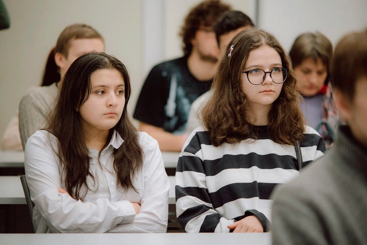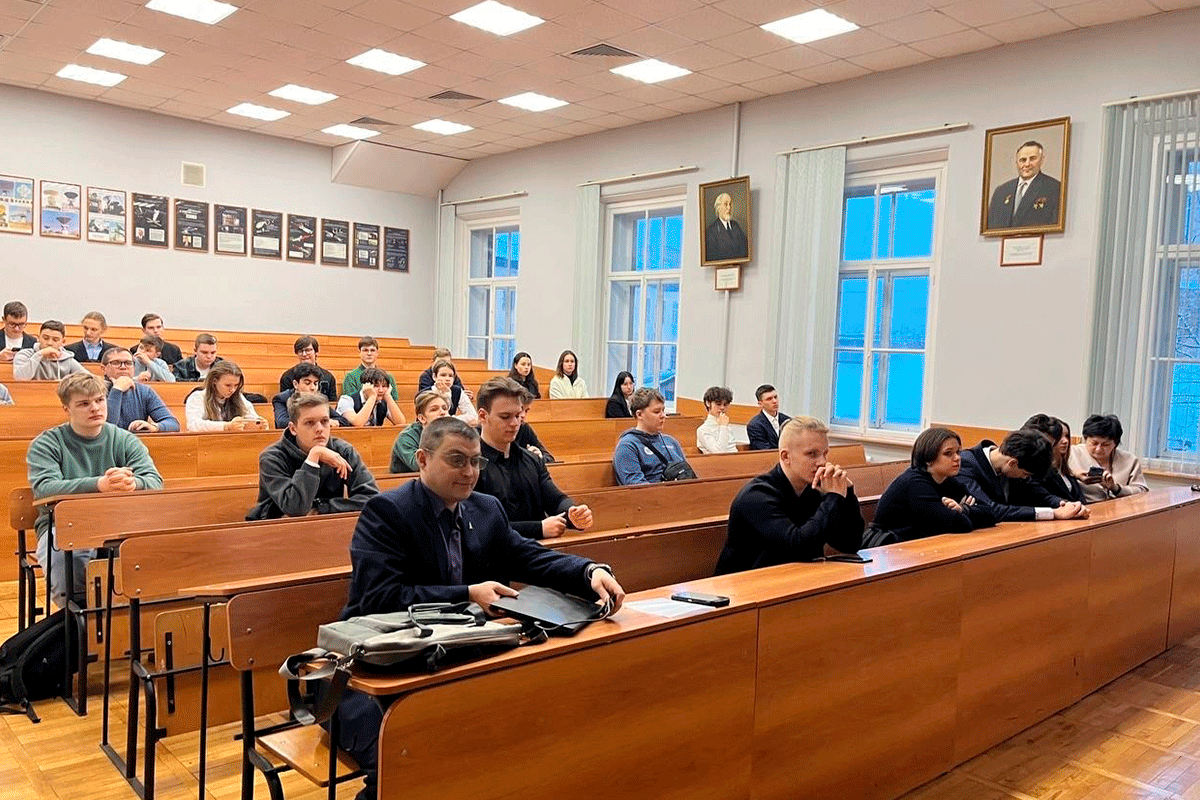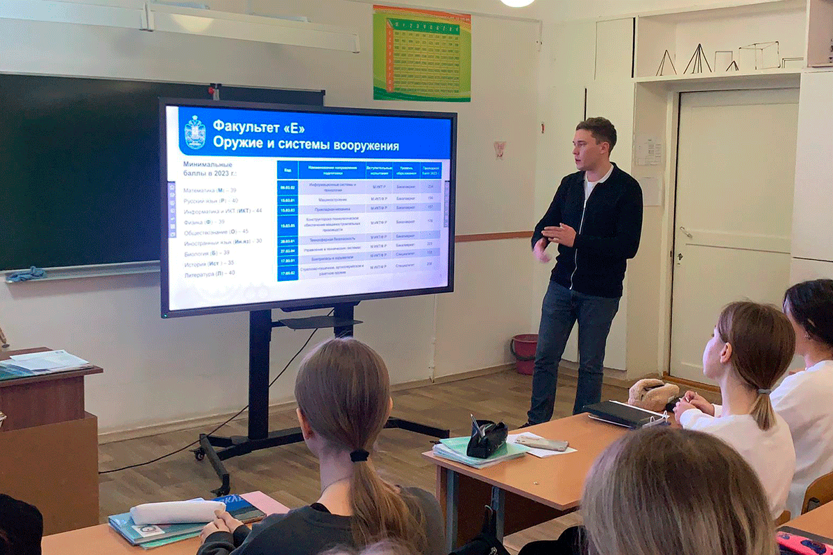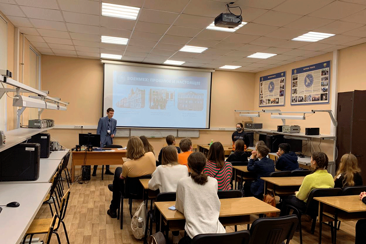 Нигматулин Руслан, студент кафедры А9 «Плазмогазодинамика и теплотехника», поделился личным опытом поступления в Военмех и рассказал об учебе в университете. Учащиеся 9 и 11 классов познали историю вуза, ознакомились с перечнем факультетов и кафедр, узнали о военном учебном центре и студенческих организациях.