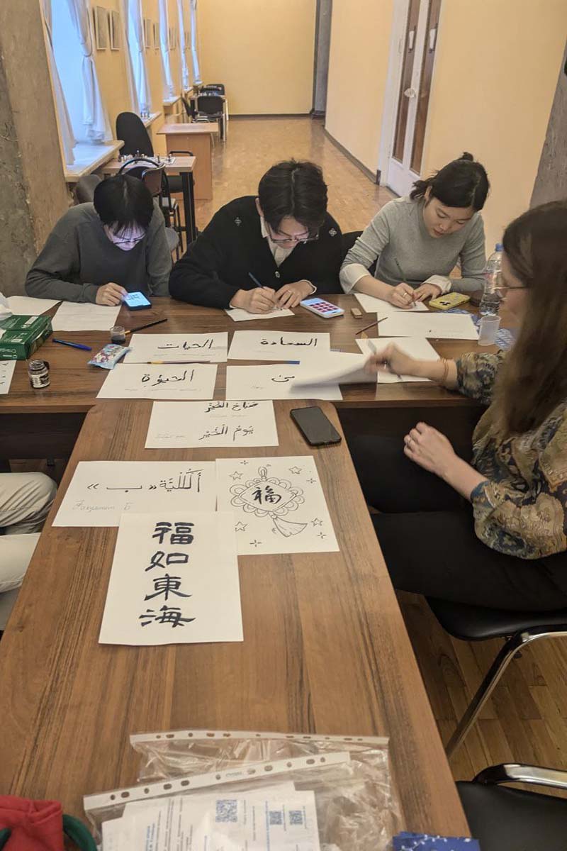 Участники с интересом пробовали свои силы в написании сложных иероглифов и красивых арабских букв, что позволило им не только развить художественные навыки, но и лучше понять культуру этих стран.