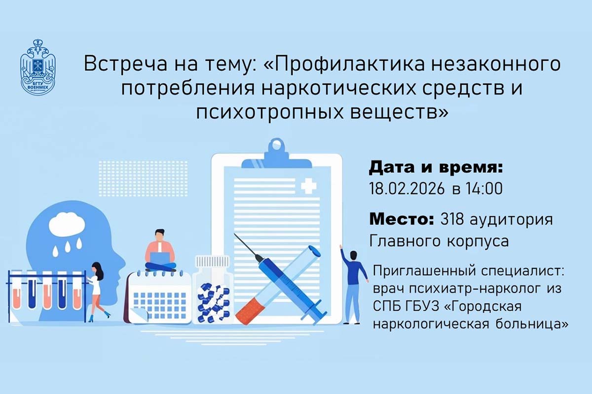 В рамках проведения профилактических мероприятий в БГТУ «ВОЕНМЕХ» им. Д.Ф. Устинова 18.02.2026 в 14:00 состоится встреча старост академических групп 1 и 2 курса с врачом психиатром-наркологом из СПБ ГБУЗ «Городская наркологическая больница» по вопросам профилактики незаконного потребления наркотических средств и психотропных веществ.