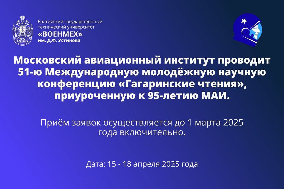 — премия им. […]Московский авиационный институт с 14 по 15 марта проводит 51-ю Международную молодёжную научную конференцию «Гагаринские чтения», приуроченную к 95-летию МАИ, которая будет проходить на территории их университета.