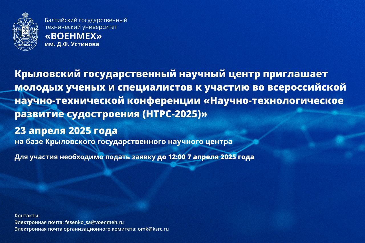 ФГУП «Крыловский государственный научный центр» объявляет о проведении Всероссийской научно-технической конференции молодых ученых и специалистов «Научно-технологическое развитие судостроения (НТРС-2025)». Мероприятие состоится 23 апреля 2025 года в Санкт-Петербурге на базе Крыловского государственного научного центра.