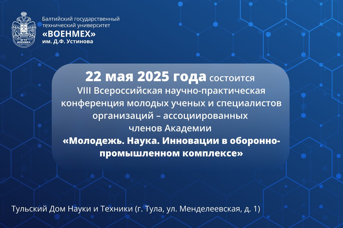 22 мая 2025 года в Тульском Доме науки и техники (г. Тула, ул. Менделеевская, д. 1) состоится VIII Всероссийская научно-практическая конференция молодых ученых и специалистов организаций – ассоциированных членов Академии «Молодежь. Наука. Инновации в оборонно-промышленном комплексе».