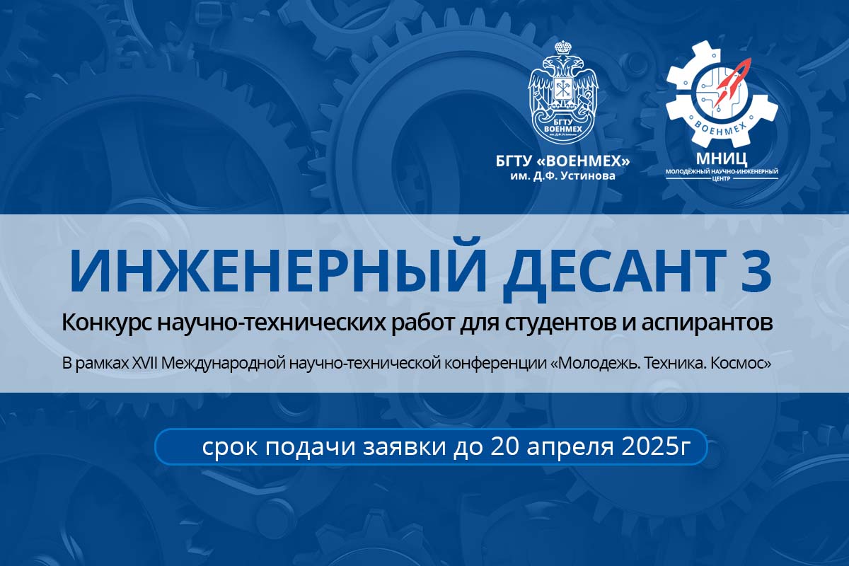 Молодёжный научно-инженерный центр студентов БГТУ «ВОЕНМЕХ» им. Д.Ф. Устинова объявляет отборочный этап внутреннего конкурса лучших научно-технических работ для студентов и аспирантов. Конкурс проводится с целью популяризации научной и научно-технической деятельности молодежи БГТУ «ВОЕНМЕХ» им. Д.Ф. Устинова, продвижения перспективных разработок, технических решений и их внедрения в научно-техническую деятельность вуза.