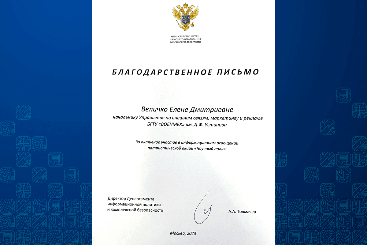В письме отмечается активное участие Военмеха в информационном освещении Всероссийской патриотической акции «Научный полк». В рамках этого проекта были написаны материалы, увековечивающие память студентов, сотрудников и преподавателей Военмеха, участвовавших […]