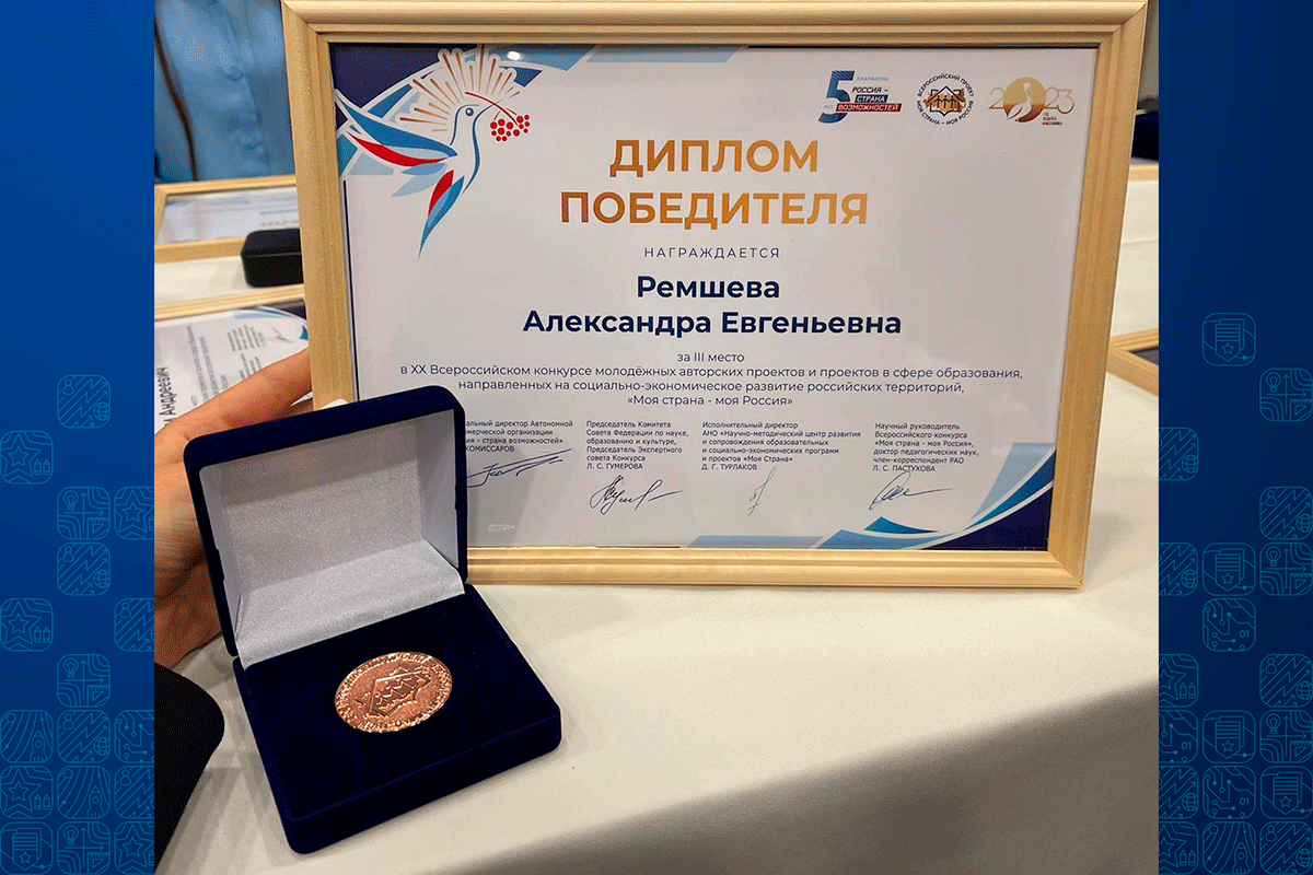 Студентка первого курса группы И132, Ремшева Александра Евгеньевна, стала победителем Всероссийского конкурса «Моя страна — моя Россия», заняв 3-е место в номинации «Моя предпринимательская инициатива» с проектом « Лаборатория 3Deла. Фабрика развития молодежных проектов».