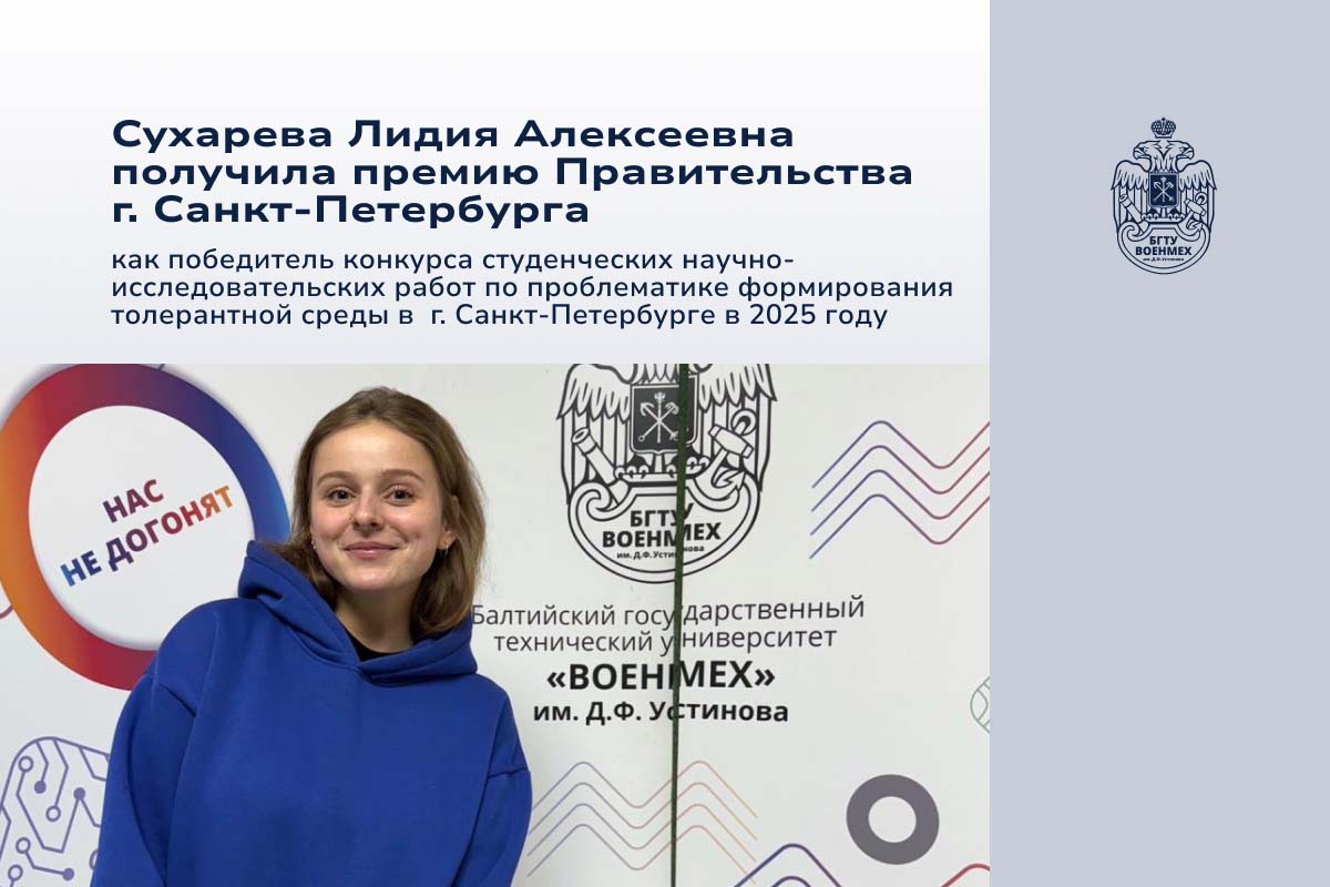 Постановлением Правительства г. Санкт-Петербурга № 676 от 16 сентября 2025 года студентке группы Р113С специальности 37.05.02 Психология служебной деятельности Сухаревой Лидии Алексеевне в номинации «Психология» присуждена премия Правительства г. Санкт-Петербурга как победителю конкурса студенческих научно-исследовательских работ по проблематике формирования толерантной среды в г. Санкт-Петербурге в 2025 году.