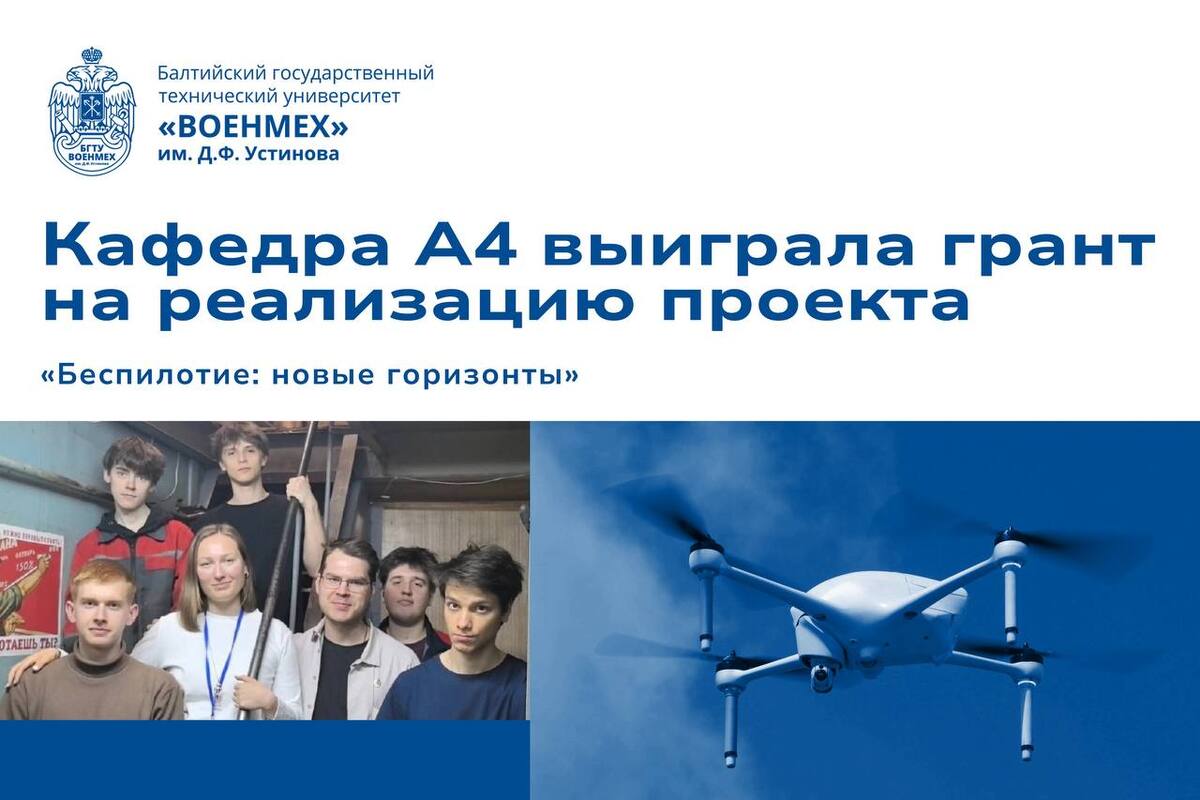 Проект «Беспилотие: новые горизонты», подготовленный Софьей Фесенко, председателем КСНО кафедры А4, совместно со студентами кафедрального студенческого научного общества кафедры А4 и под руководством Иванова Петра Константиновича, стал победителем Вссероссийского конкурса по поддержке молодёжных проектов «Росмолодёжь.Гранты»!