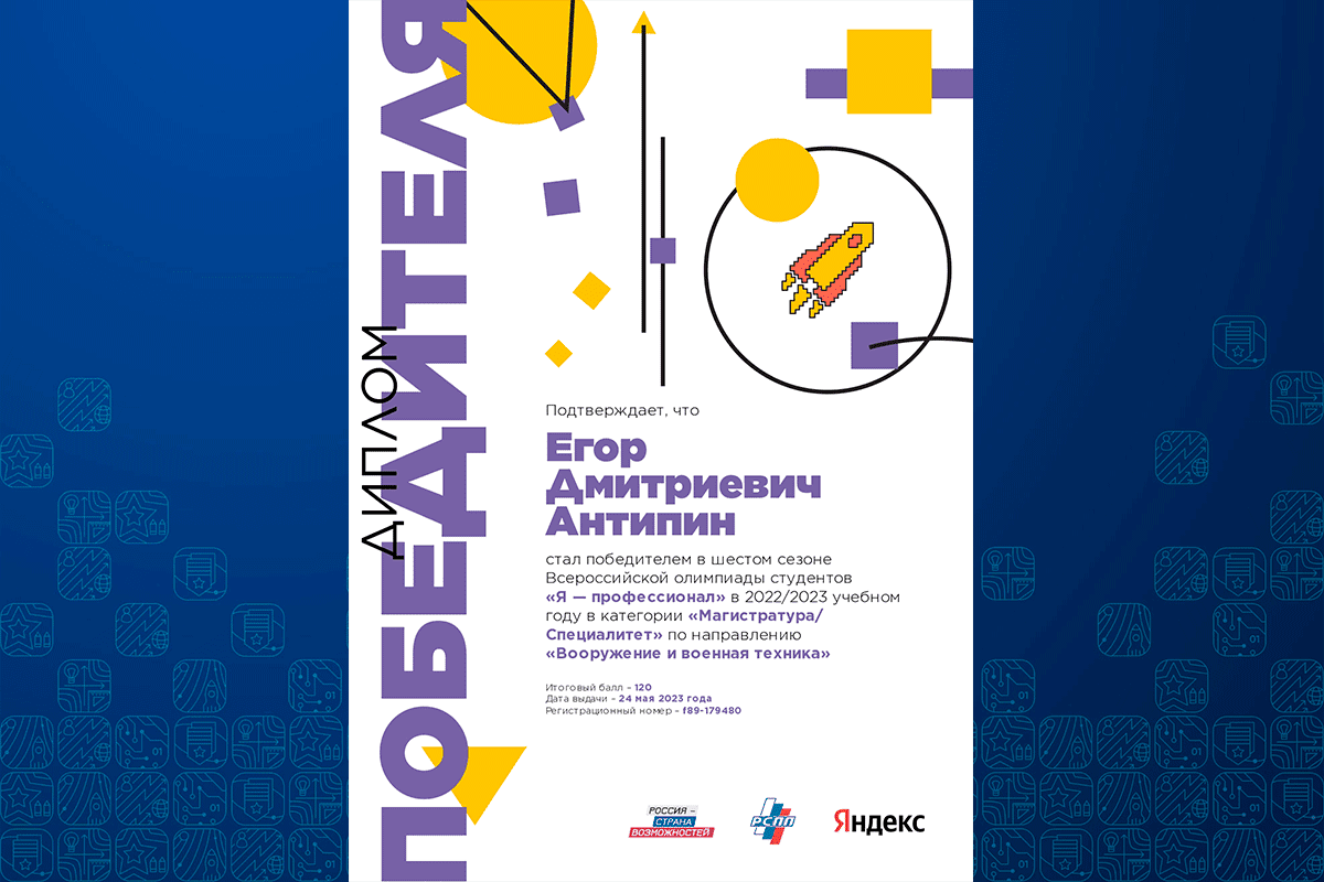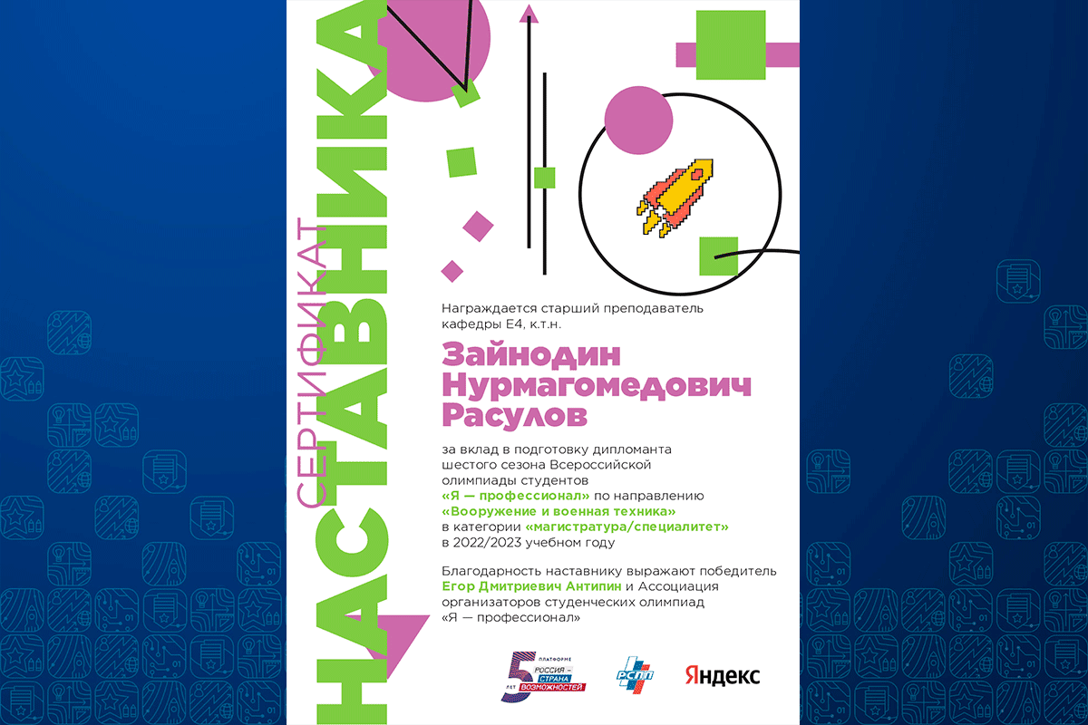 Ассоциация организаторов олимпиады выражает благодарность ст. преподавателю кафедры Е4, к.т.н. Расулову Зайнодину Нурмагомедовичу за вклад в подготовку победителя-дипломанта шестого сезона Всероссийской олимпиады «Я – профессионал» по направлению «Вооружение и военная […]