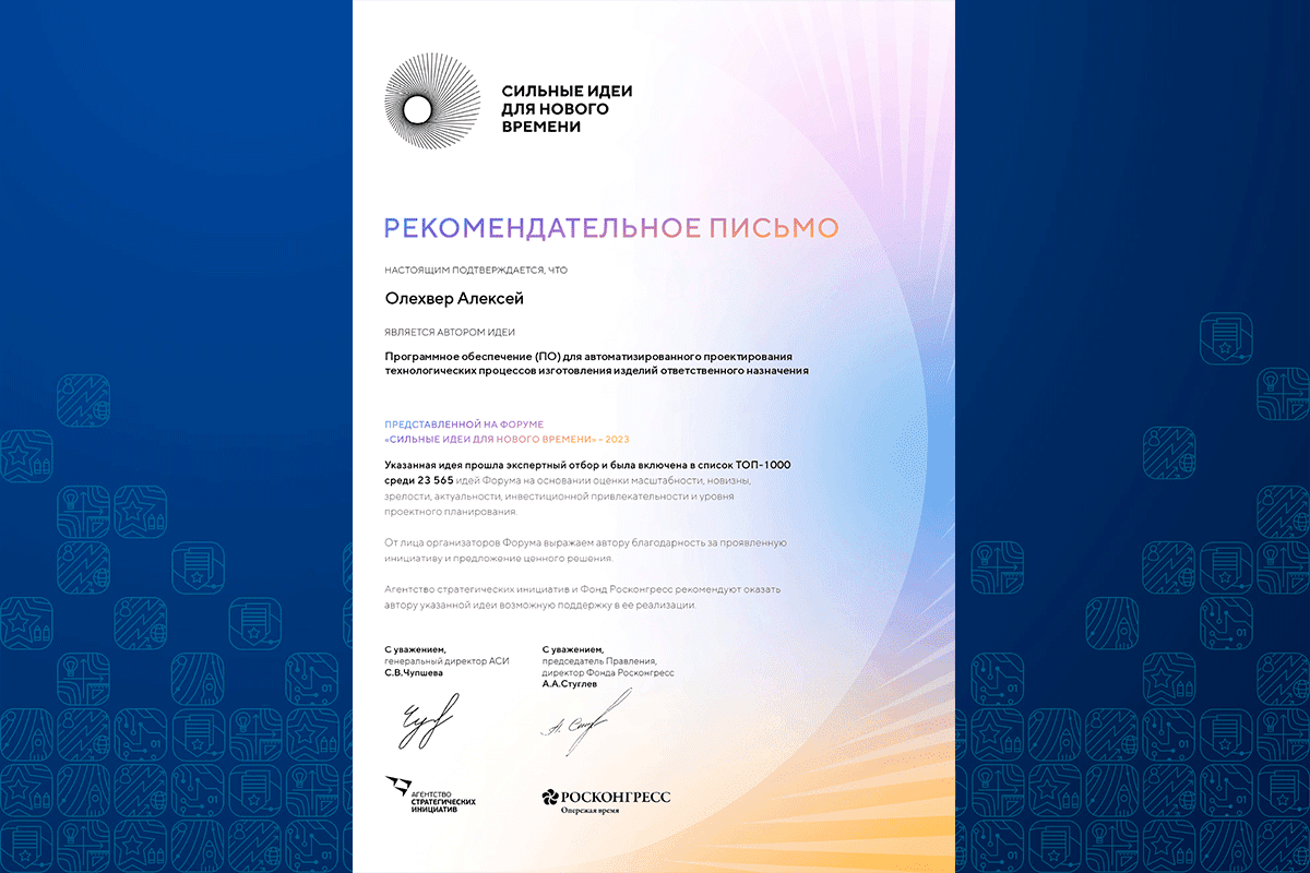 Доцент кафедры Е4 «Высокоэнергетические устройства автоматических систем» Олехвер Алексей Иванович принял участие в конкурсе «Сильные идеи для нового времени» — 2023 и вошел в ТОП-1000 проектов среди 23 565 идей.