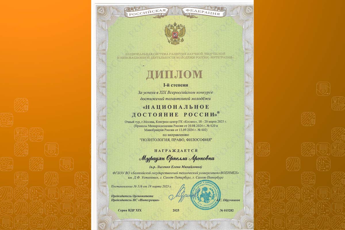 Постановлением Правительства г. Санкт-Петербурга № 676 от 16 сентября 2025 года студентке группы Р113С специальности 37.05.02 Психология служебной деятельности Сухаревой Лидии Алексеевне в номинации «Психология» присуждена премия Правительства г. Санкт-Петербурга как победителю конкурса студенческих научно-исследовательских работ по проблематике формирования толерантной среды в г. Санкт-Петербурге в 2025 году.