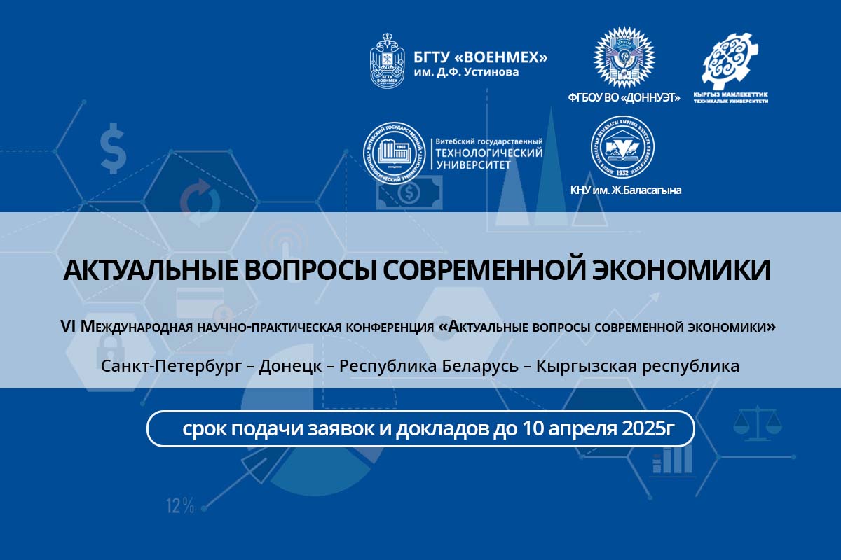 23-24 апреля 2025 года Балтийский Государственный Технический Университет «ВОЕНМЕХ» им. Д.Ф. Устинова, Донецкий национальный университет экономики и торговли им. Михаила Туган-Барановского, Витебский государственный технологический университет, Кыргызский государственный технический университет им. И. Раззакова, Кыргызский национальный университет имени Жусупа Баласагына, приглашают Вас принять участие в работе VI Международной научно-практической конференции «Актуальные вопросы современной экономики».