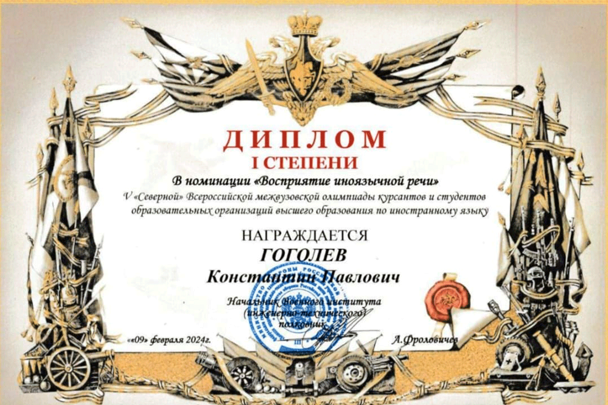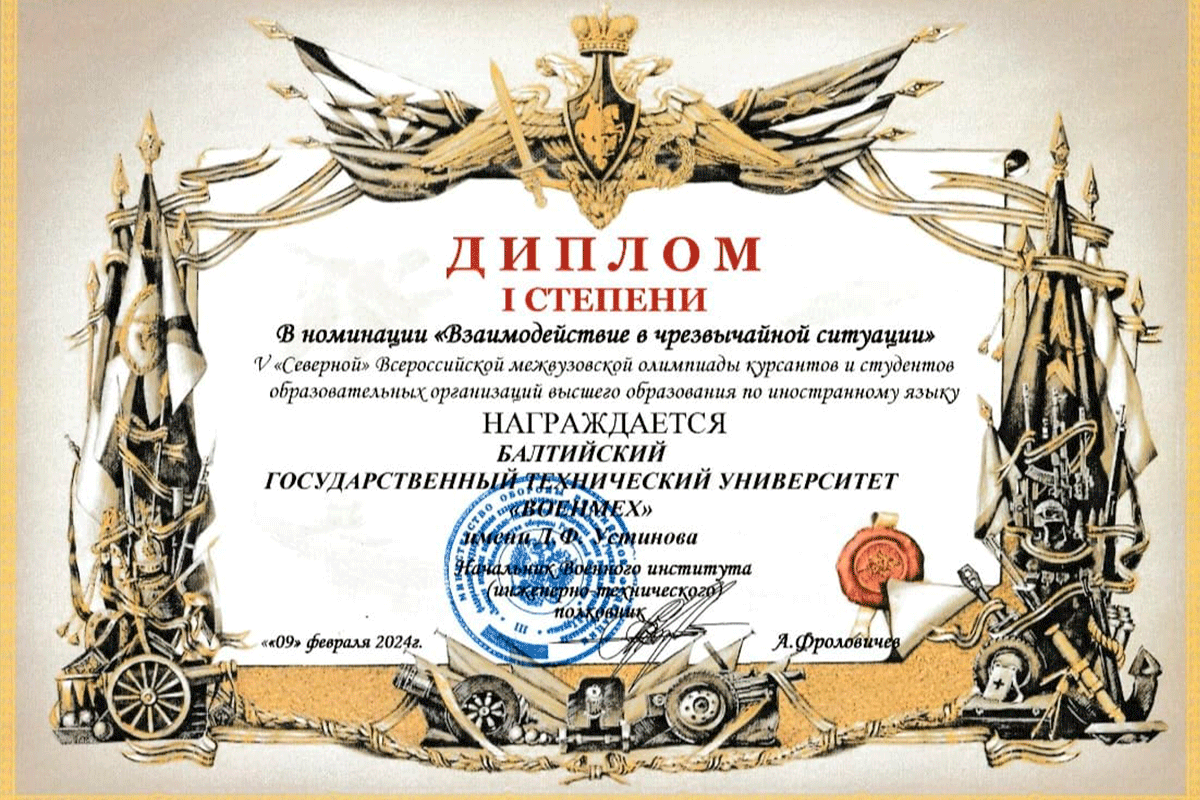 7-9 февраля 2024 года студенты кафедры Р7 приняли участие и завоевали 1 место в командном зачете в номинации «Взаимодействие в чрезвычайной ситуации» в V Северной Всероссийской межвузовской олимпиаде курсантов и студентов образовательных организаций высшего образования по иностранному языку, которая проходила на базе Военного инженерно-технического института имени генерала армии А.В. Хрулева.