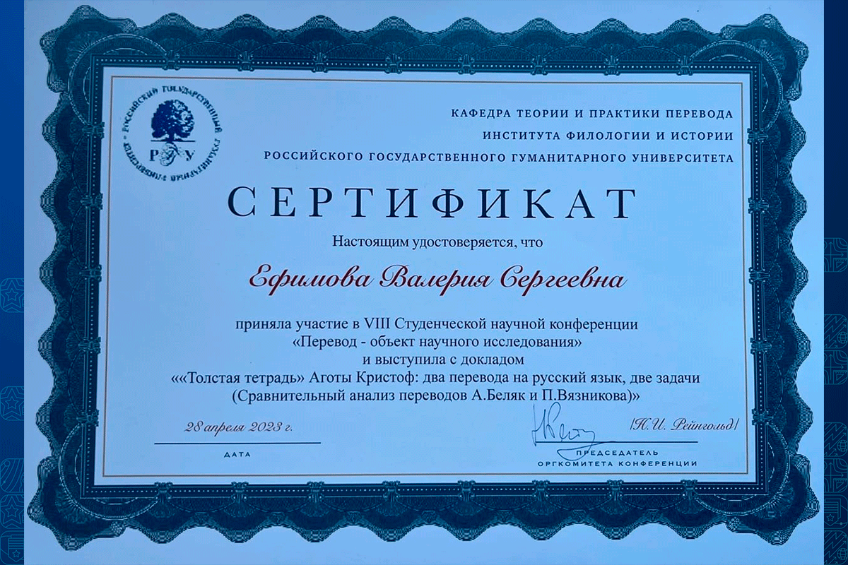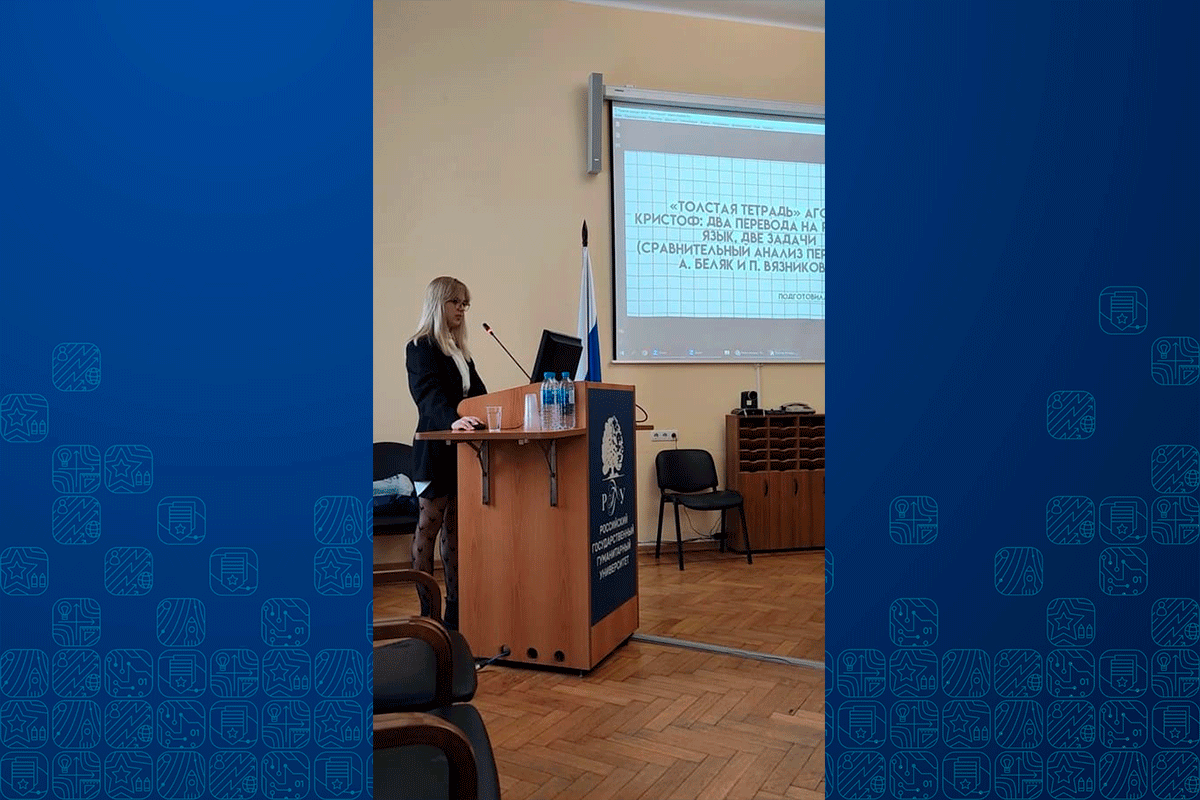 Студентки 3-го курса кафедры Р7 «Теоретическая и прикладная лингвистика», Валерия Ефимова и Софья Лекандрова, а также студентка 5-го курса Вероника Сорокина приняли участие в VIII студенческой научной конференции «Перевод — объект научного исследования», проведенной кафедрой теории и практики перевода Института филологии и истории РГГУ (г. Москва).