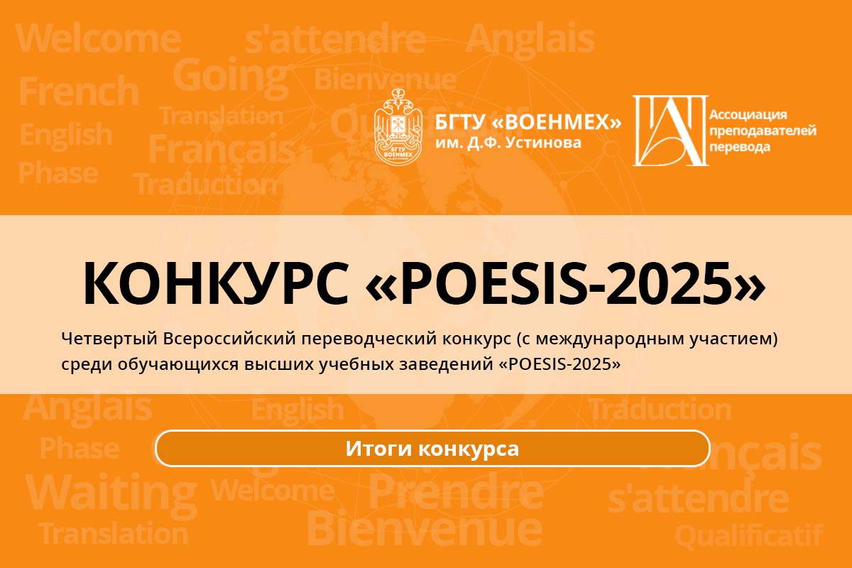 Кафедра «Теоретической и прикладной лингвистики» БГТУ «ВОЕНМЕХ» им. Д.Ф. Устинова совместно с Ассоциацией преподавателей перевода объявляют о начале работы Четвертого Всероссийского переводческого конкурса (с международным участием) среди обучающихся высших учебных заведений «POESIS-2025».