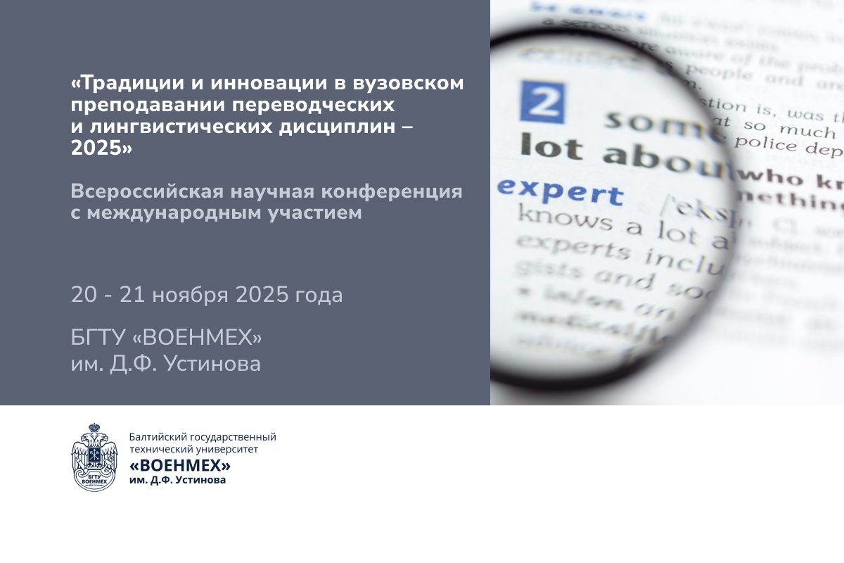 20 — 21 ноября 2025 года состоится научно-практическая конференция, проводимая БГТУ «ВОЕНМЕХ» им. Д.Ф. Устинова (г. Санкт-Петербург) Всероссийская научная конференции с международным участием «Традиции и инновации в вузовском преподавании переводческих и лингвистических дисциплин – 2025» БГТУ «ВОЕНМЕХ» им. Д.Ф. Устинова.