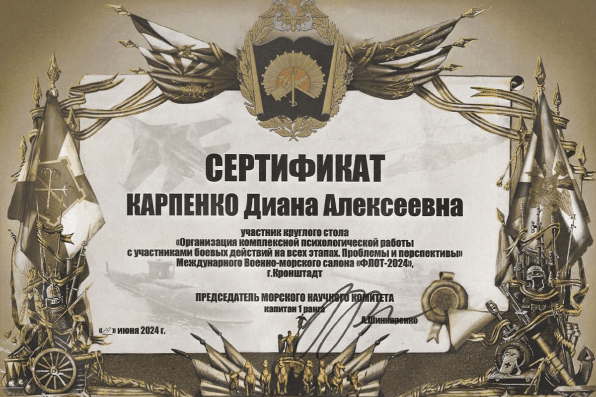 Начальник Отдела психологического сопровождения, кандидат психологических наук, доцент Карпенко Диана Алексеевна в рамках Международного военно-морского салона «ФЛОТ-2024» приняла участие в круглом столе на тему: «Организация психологической реабилитации участников боевых действий. Проблемы и перспективы», организатором которого являлась Военно-морская академия им. Н.Г. Кузнецова.