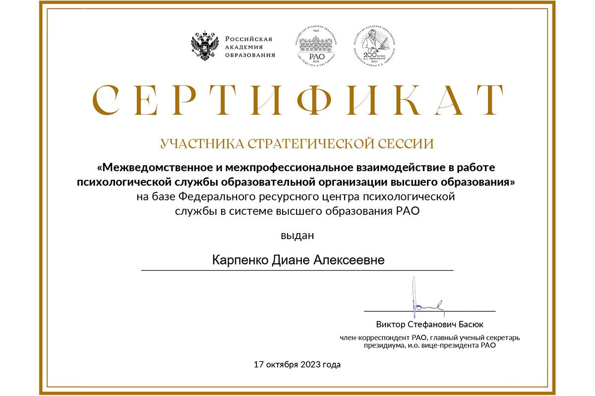 17 октября 2023 г. в РАО состоялась IV Стратегическая сессия «Межведомственное и межпрофессиональное взаимодействие в работе психологической службы образовательной организации высшего образования», в которой приняла участие начальник Отдела психологического сопровождения, к.п.н., доцент Карпенко Диана Алексеевна.