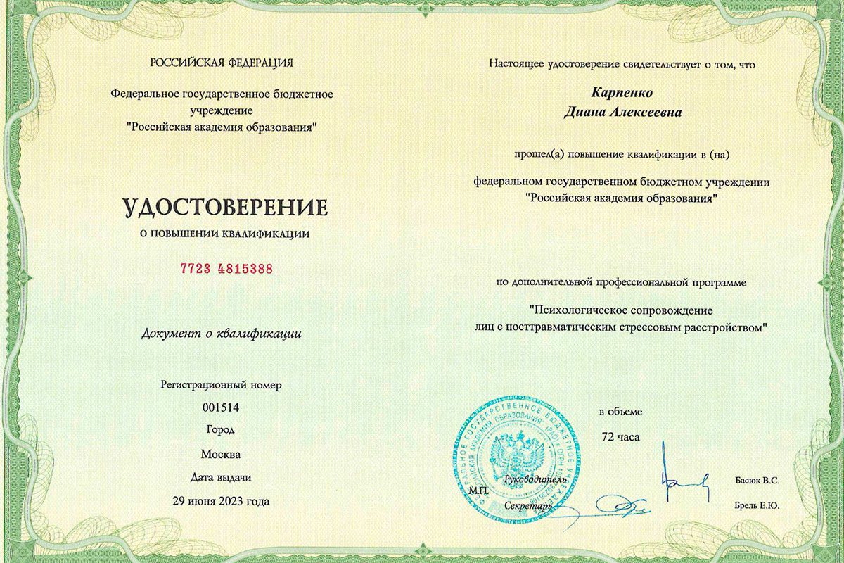 29 июня 2023 г. в Российской академии образования прошел заключительный модуль программы повышения квалификации «Психологическое сопровождение лиц с посттравматическим стрессовым расстройством».