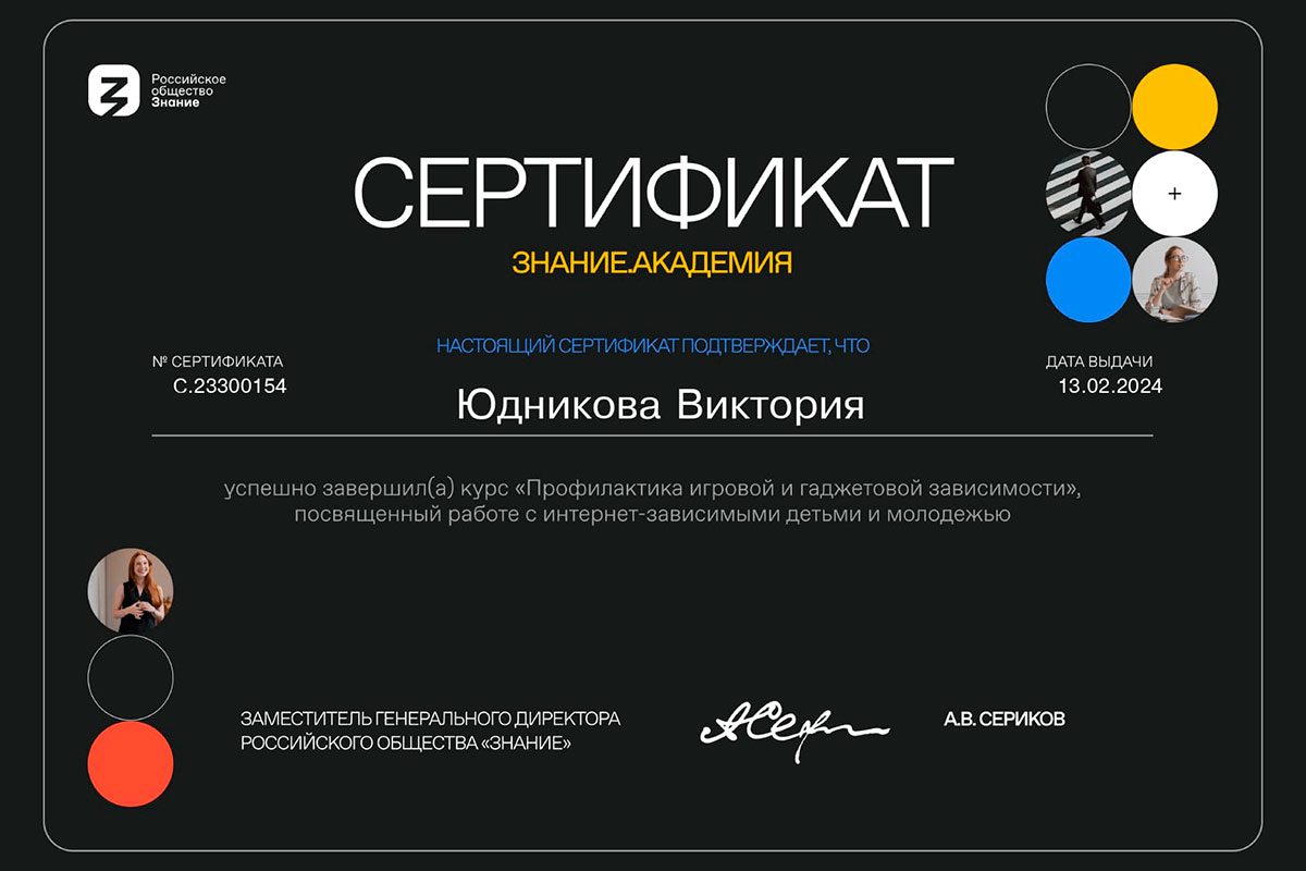 Ведущий психолог Отдела психологического сопровождения ФГБОУ ВО «Балтийский государственный технический университет «ВОЕНМЕХ» им. Д.Ф. Устинова» Юдникова Виктория Дмитриевна завершила обучение на курсе «Профилактика игровой и гаджетовой зависимости», посвященном работе с интернет-зависимыми детьми и молодежью.
