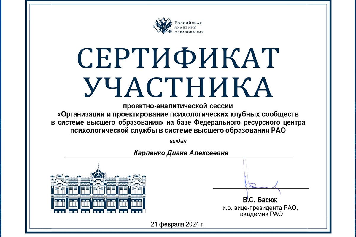 21 февраля 2024 г. начальник Отдела психологического сопровождения ФГБОУ ВО «Балтийский государственный технический университет «ВОЕНМЕХ» им. Д.Ф. Устинова», кандидат психологических наук, доцент Карпенко Диана Алексеевна приняла участие в проектно-аналитической сессии «Организация и проектирование психологических клубных сообществ в системе высшего образования», проводимой Российской академией образования.