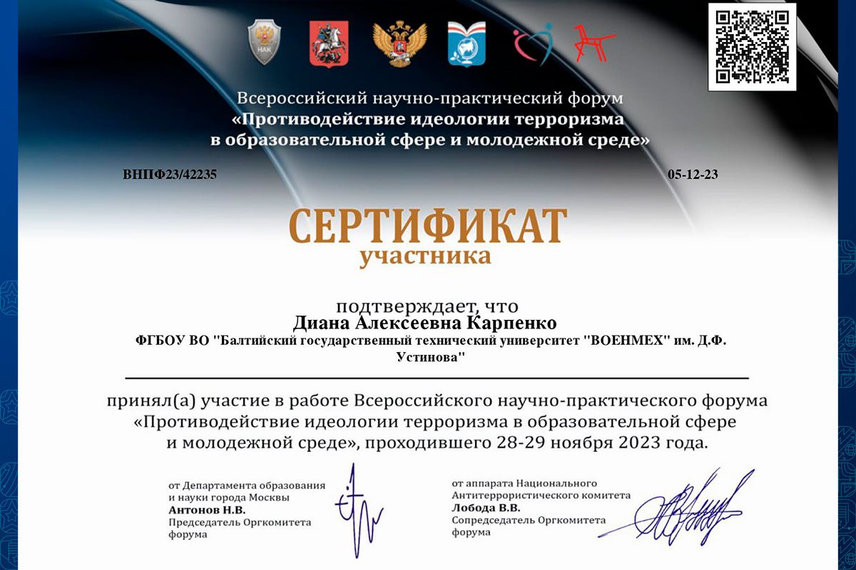 В период с 28 по 29 ноября 2023 года начальник Отдела психологического сопровождения, к.п.н., доцент Карпенко Диана Алексеевна приняла дистанционное участие во Всероссийском научно-практическом форуме «Противодействие идеологии терроризма в образовательной сфере и молодежной среде», организованном в целях совершенствования работы по противодействию идеологии терроризма Департаментом образования и науки города Москвы под эгидой Национального антитеррористического комитета.