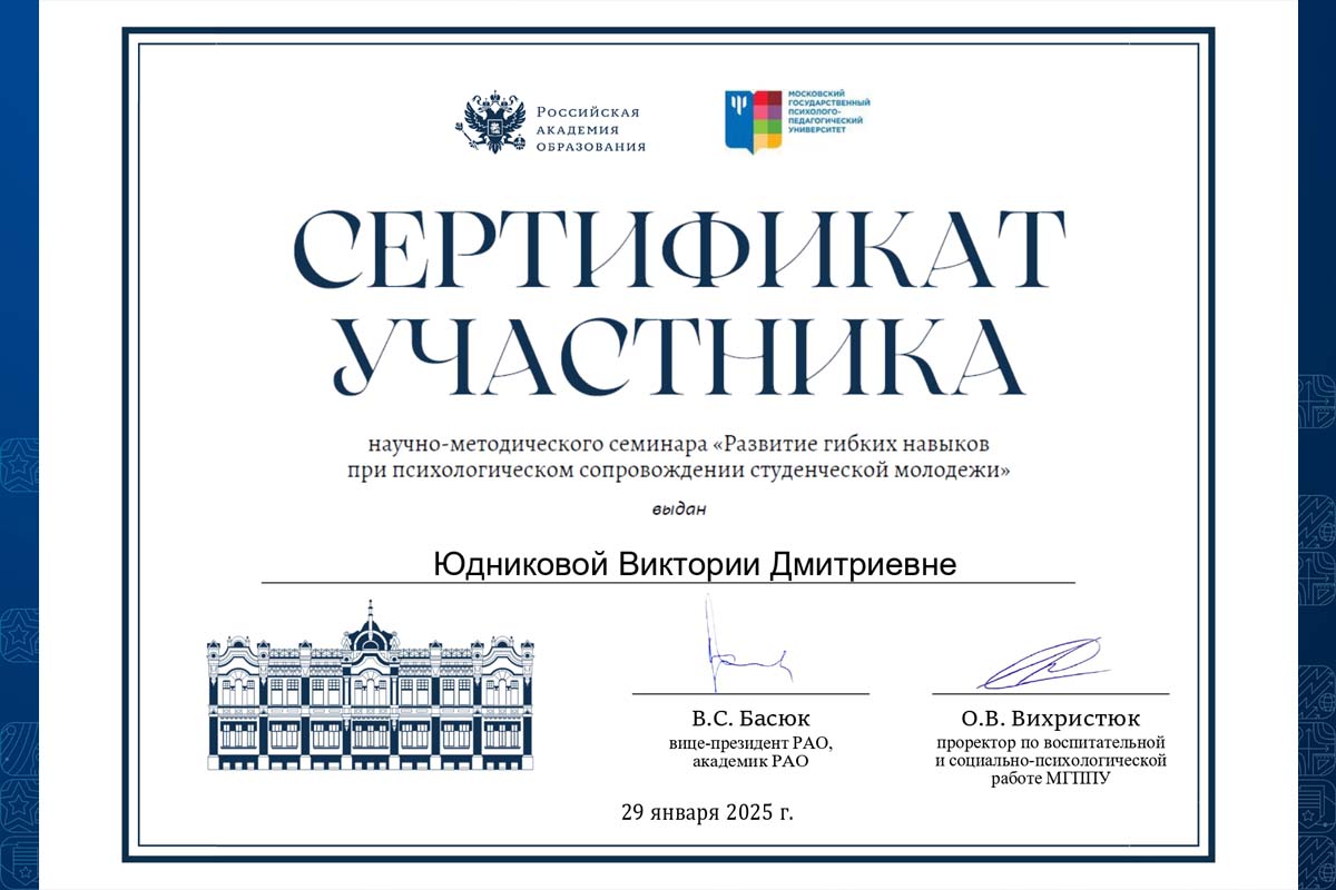 Начальник Отдела психологического сопровождения к.п.н., доцент Карпенко Д.А. и ведущие психологи Сокун Д.А. и Юдникова В.Д. приняли участие в научно-методическом семинаре на тему: «Развитие гибких навыков при психологическом сопровождении студенческой молодежи», проведенном Федеральным ресурсным центром психологической службы в системе высшего образования РАО в рамках реализации плана образовательных мероприятий ФРЦ РАО с целью научно-методического совершенствования по […]