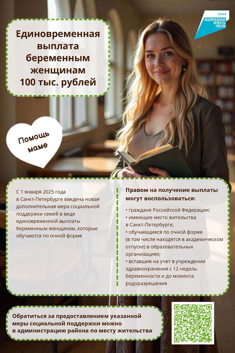 4) Единовременная выплата в размере 100 тысяч рублей при постановке на учет по беременности женщине, обучающейся по очной форме обучения