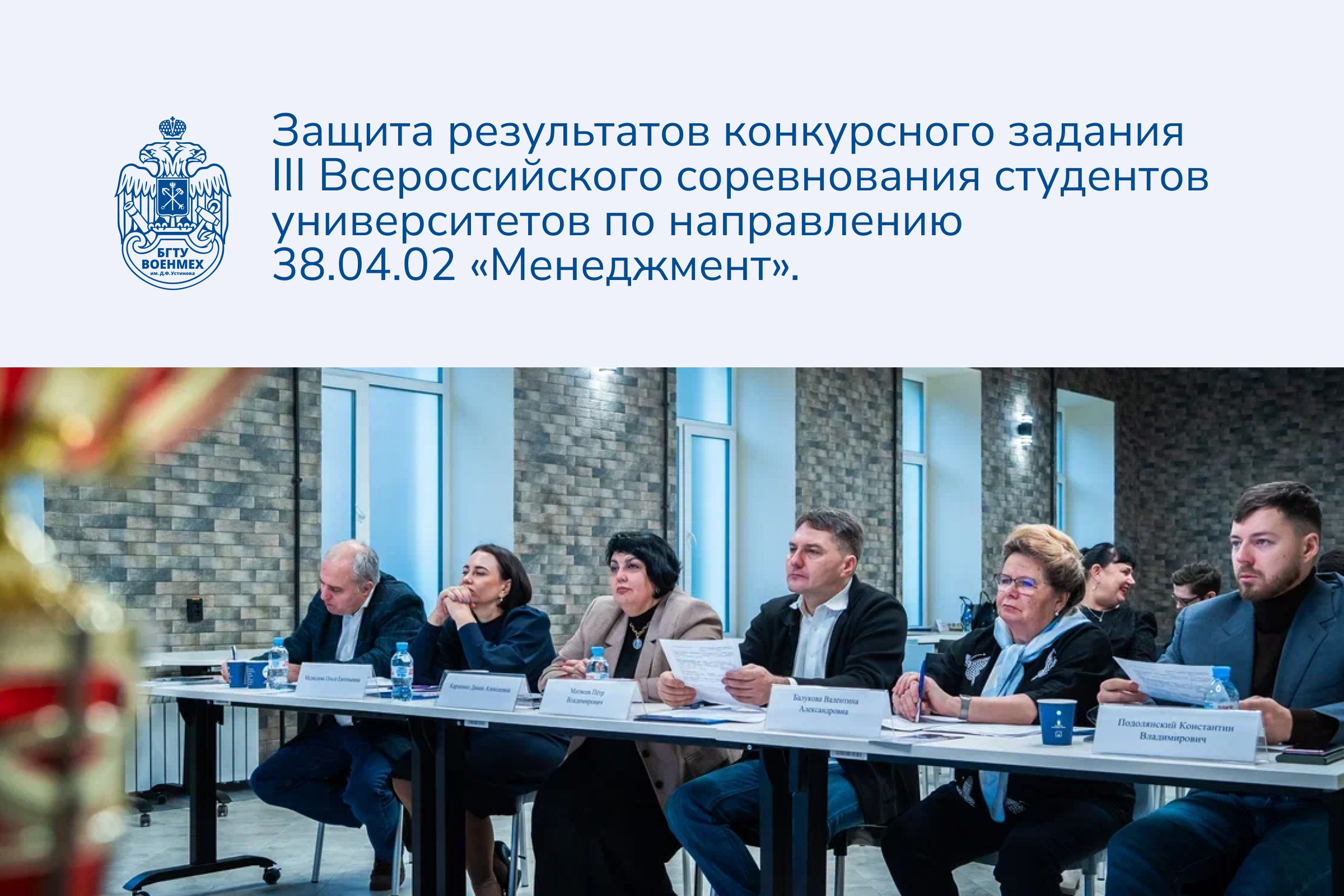 5 декабря в БГТУ «ВОЕНМЕХ» им. Д.Ф. Устинова прошла защита результатов конкурсного задания в очном и дистанционном форматах III Всероссийского соревнования студентов университетов по направлению 38.04.02 «Менеджмент».